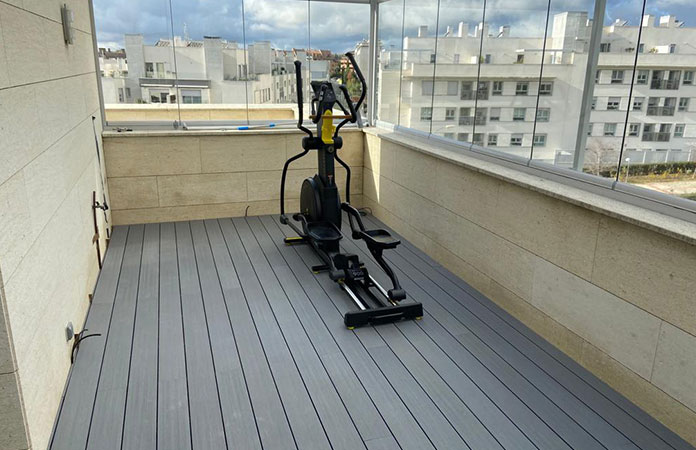Nuestra tarima para terrazas, combinada con un cerramiento de cristal, crea un espacio seguro, elegante y perfectamente nivelado para entrenar con luz natural y sin preocupaciones.